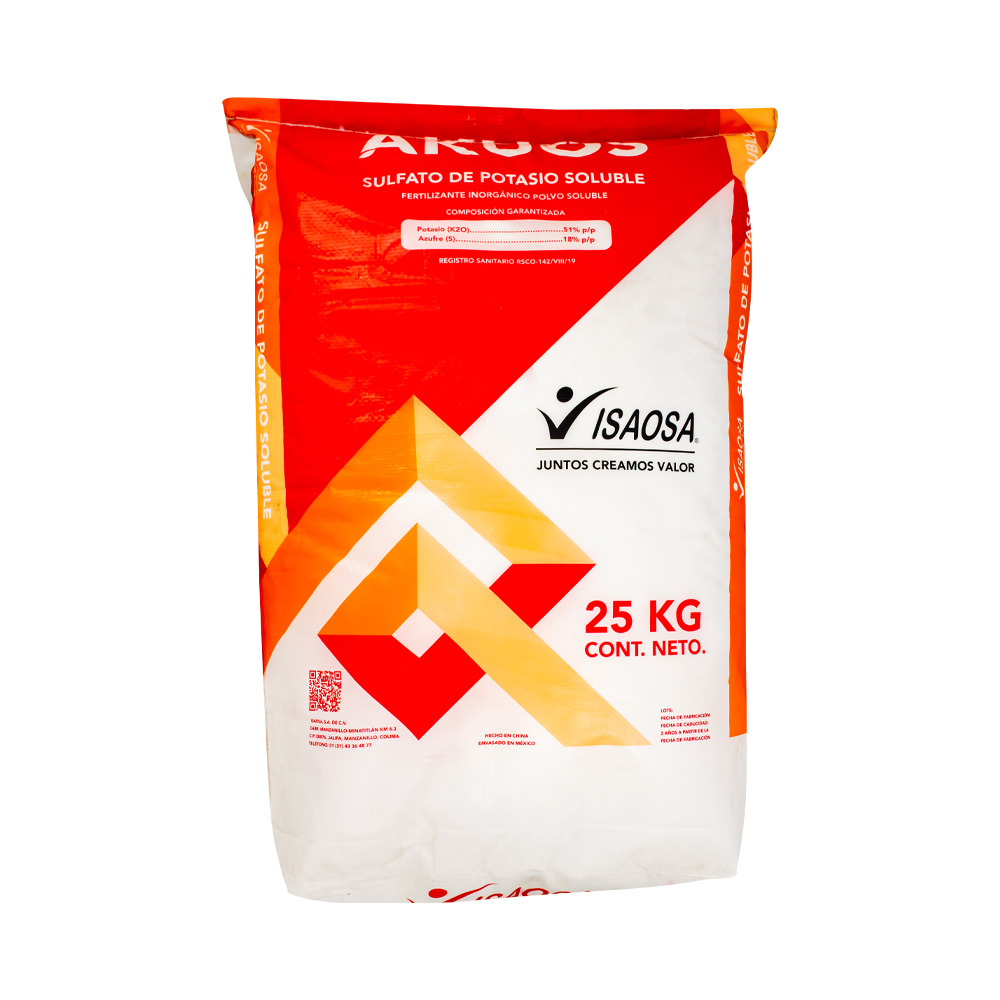 Descripción general: SULFATO DE POTASIO. 0 0 51. Fertilizante sólido 100% soluble en agua, con una concentración de Potasio del 51% y de Azufre al 18% con una pureza del 99%. Fertilizante 100% soluble y se puede disolver hasta 120 gr/l y con una cantidad mínima de insolubles <0.2%. Ideal para aportar Potasio sin aplicar Nitrógeno y en cultivos sensibles al Cloro. El SOP es recomendado cuando los cultivos requieren Potasio y no queremos adicionar Nitrógeno, además por su proceso de producción -proceso Mannheim- el contenido de cloruro es menos del 0.8%. Soluble y rápido de disolver, se puede disolver hasta 135 gr/l y con una cantidad mínima de insolubles <0.2%.